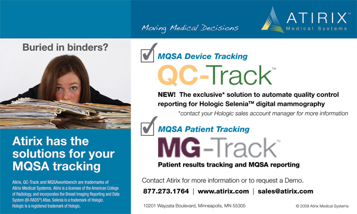 Minneapolis, September 1, 2008 — Atirix Medical Systems today announced the release of QC-Track™ quality control software for the Hologic Selenia full field digital mammography system.